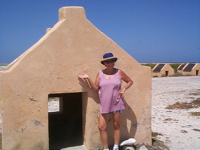 very tiny one-room concrete dwellings that were once used to house the slaves that labored in the salt works. Instead of turning around there to go back, as we originally planned, we decided to continue on for awhile. We spotted a couple more flamingos and the next group of slave huts. Claudia had read that there was a lighthouse on down the road a bit more and suggested that we go at least that far … and we did. However, by this time we had run out of water, it was the hottest part of the afternoon and we discovered that the nearest location of liquid refreshment would be found by continuing our circuitous route around the southern half of the island! And we did. There is a commercial establishment at a beach at Lac Bay where you can rent wind-surfers or swim in the shallow waters of the bay. We found the beach bar where we rehydrated with cold drinks and refilled our water bottles before pedaling our way back to Kralendijk. When we made it back to the boat I looked at a map and calculated that our cycling tour had covered 23 miles. Keep in mind that these bicycles of ours aren’t 18-speed mountain bikes but little, folding bikes … kinda like the ones that clowns ride in a circus! We decided that we’d better slow the pace down a bit and wait for Randy and Karen to arrive before we toured the rest of the island.