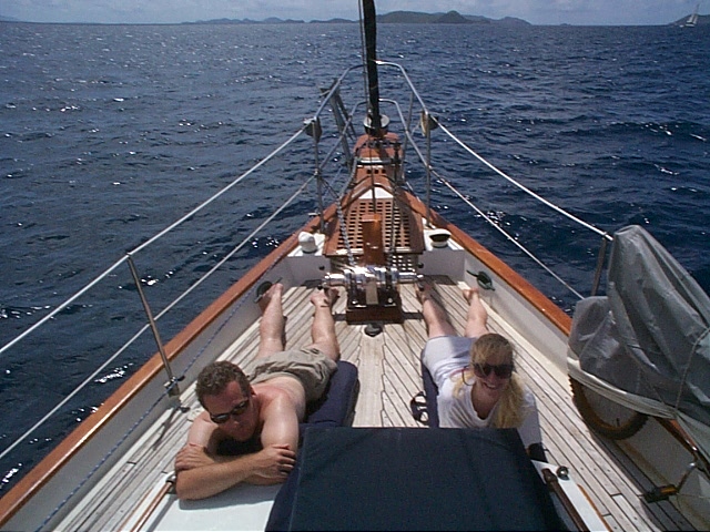 However, two weeks later we swung right back into vacation-mode when Gary and Vanessa arrived for their visit. Things got off to a fast start as we sailed offshore from Water Island heading toward St. John and Gary caught the last two fish in the Virgin Islands. The first was a barracuda who got tossed back after we carefully removed the hooks without losing any fingers. The next one, though, was a definite keeper; a very nice-sized, two-dinners-for-four Wahoo! Actually, there must have been at least a couple more fish in the ocean because Gary almost caught them, too. Problem was, I had just replaced the rusty hooks on a couple of good lures but they turned out to be too puny and these sea monsters bent the hooks straight and slid off! Well, one morning we had an experience that would top any fish story. We were just coming out of the cut in the reef from Cane Garden Bay when Claudia let out a shriek, “Oh my